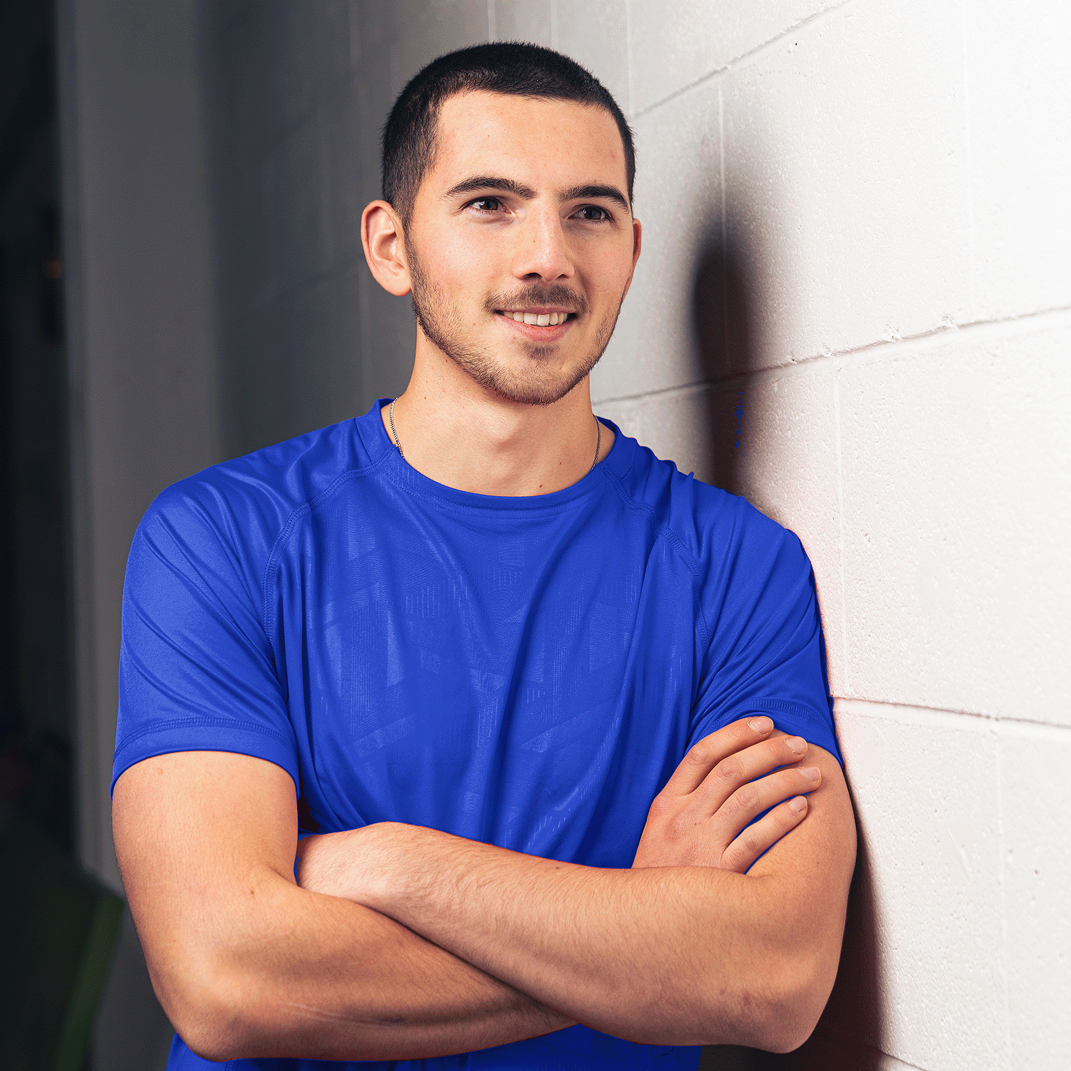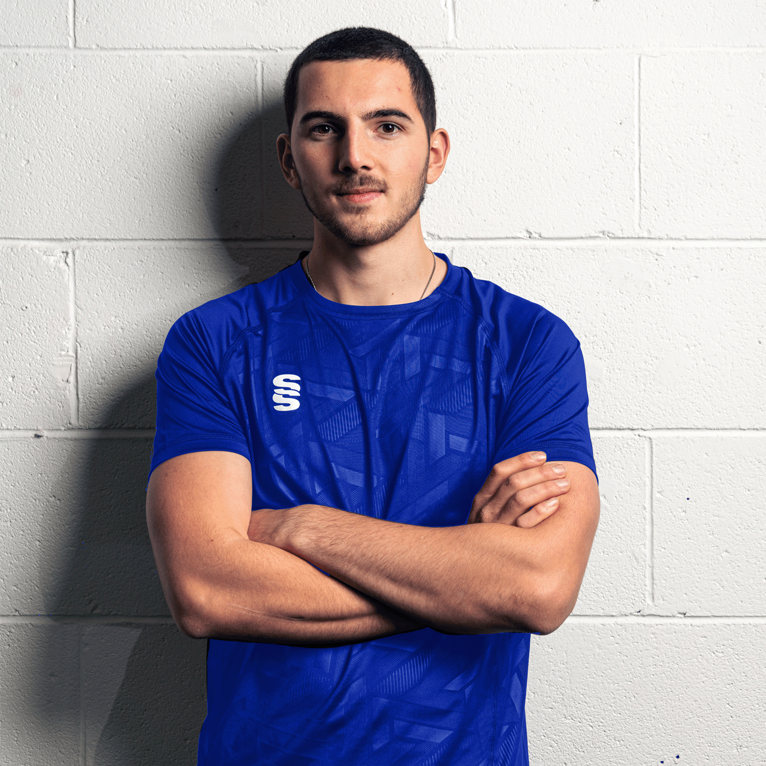 Crew neck fitted polyester interlock material with highly modern print to the from panel